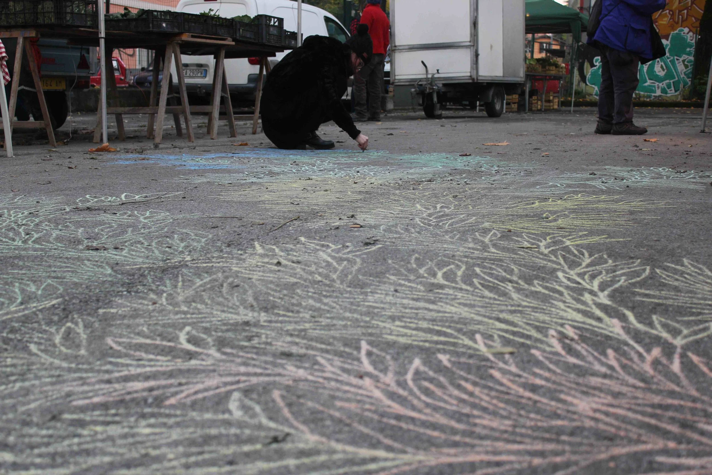 Drawing Performance with colored chalks on asphalt at Vag61, Bologna, Italy